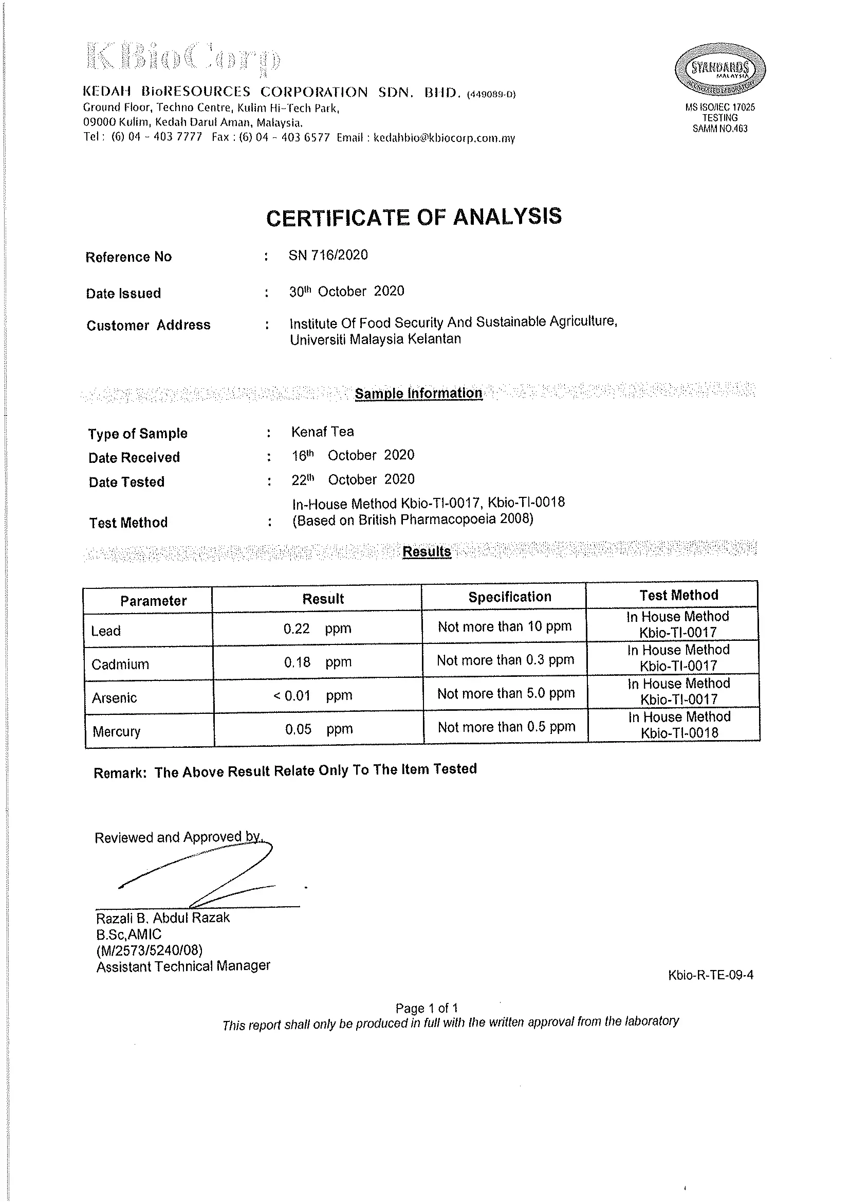 Biokenaf® telah dikelaskan oleh Kementerian Kesihatan Malaysia (KKM) sebagai makanan kesihatan befungsi tidak dikawal.